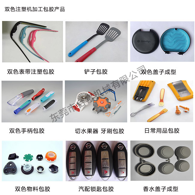 雙色注塑機加工產品有以下雙色物用品:牙刷,手柄,表帶,多色切水果器,眼鏡框,雙色鏟子等等。如想了解多些注塑機應用在什么產品上,可以瀏覽臺富機械網址或來我們公司參觀。
